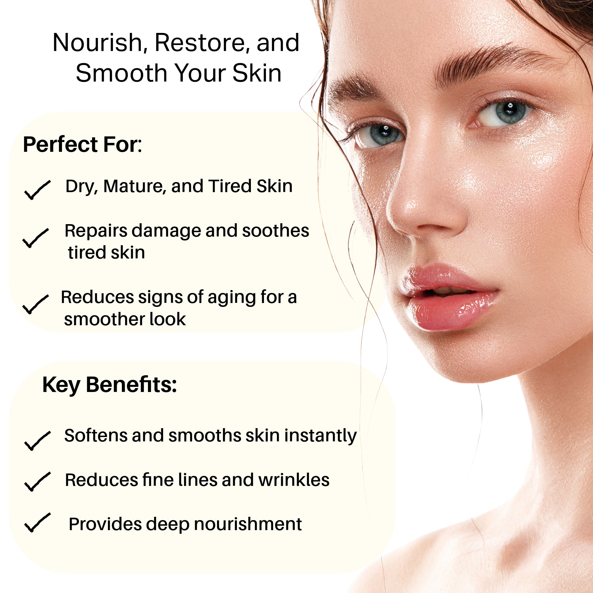 Organic (Sea Buckthorn Oil, Safflower Oil, Borage Seed Oil, Evening Primrose Oil, Rosehip Oil, Jojoba Oil, Grape Seed Oil), Squalane, Organic (Lavender Oil and German Chamomile Oil).